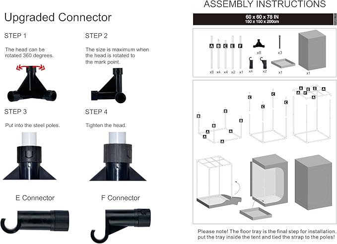 - Upgrade Design --- UPGRADED CONNECTOR--Durable PA Material Adopted, Anti-rust Reinforced Design, Adjustable Tightness According to The Pole, Hold Poles Tightly for Firmed Support. Multiple vents to accommodate fans and filter; ducting rectangle window with mesh to keep dust and insects out; Removable mylar floor tray easy to clean.