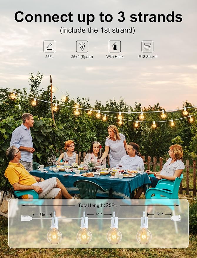 - Connectable and portable: 25 hanging sockets, 6 inch lead with male plug, 12 inch spacing between bulbs, 6 inch tail with female connector, total length 25 feet. End to end connect up to 3 strands. Portable size for easy carrying and storage