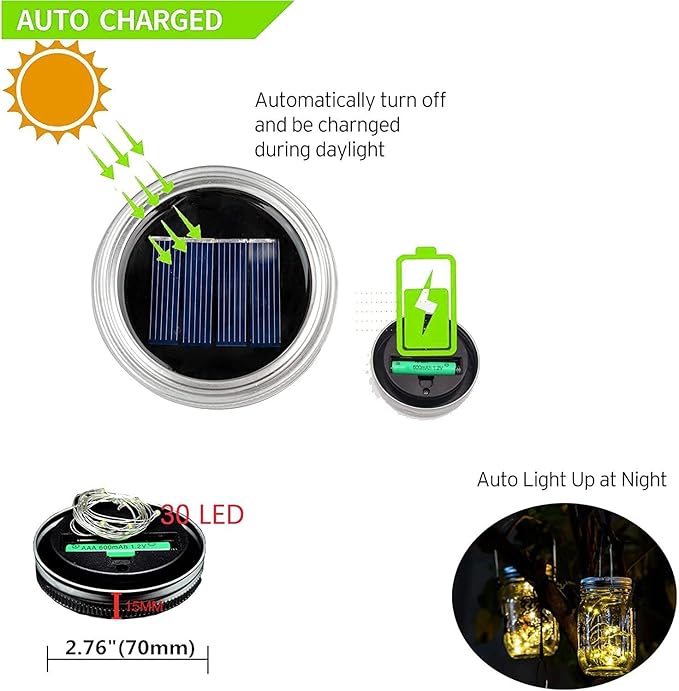 - 6 Mason Jar Solar lights:Made of 30 cool white bright LED beads twisted into silver wire, 100% solar panel power supply, energy saving and environmental protection, the lid is aluminum structure, 1.8 watt LED light and 1.2 volt battery, 6 stainless steel handles