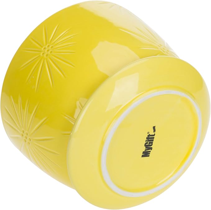- Made of durable ceramic with a vibrant yellow finish and starburst design
