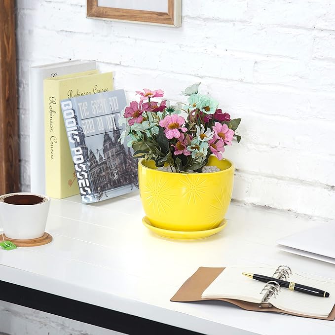 MyGift 7 Inch Round Yellow Ceramic Plant Pot with Drainage Hole and Attached Saucer, Modern Decorative Embossed Sunburst Planter Container for Indoor Home Garden