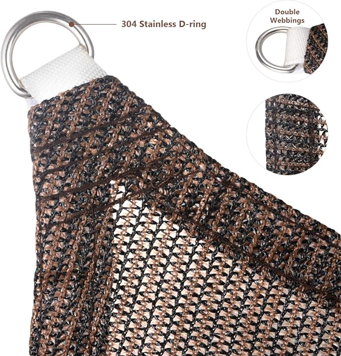 - High Quality Guarantee: Our shade sail made from non-recycled HDPE (high-density polyethylene) 180gsm, industrial cross-weaving for superior support & long-lasting durability. Ready to hoist upon sturdy connections at all four corners. Easy to install, very thick & durably-enforced webbing. Our shade sail includes 304 Stainless Steel D-rings stitched seamlessly into its corners & comes with nylon ropes for convenience, length & width are measured from D-ring to D-ring