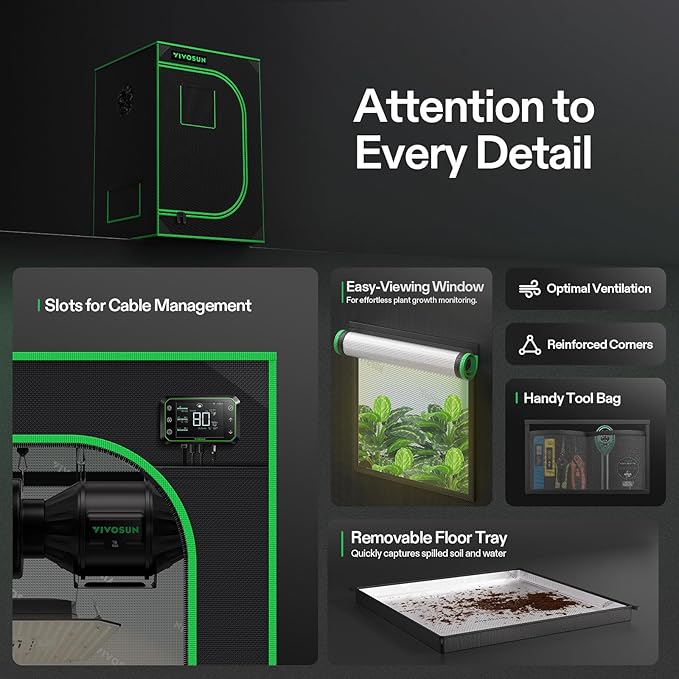 - Considerate Design & More Options: The plant grow tent offers plenty of openings for setting duct fans, lamps, electrical cords, etc.; The inner tool organizer is handy to put all your gardening tools based on your need; The tent is suitable for different places in your house, such as the domestic garage, balcony, laundry room, closet, and so on; We also provide various sizes of grow tents to meet your daily demands