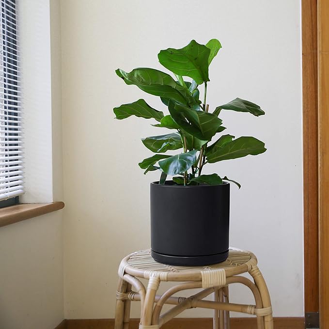 D'vine Dev 10 Inch Ceramic Planter Pot with Drainage Hole and Saucer, Indoor Cylinder Round Planter Pot, Black, 94-O-E-2