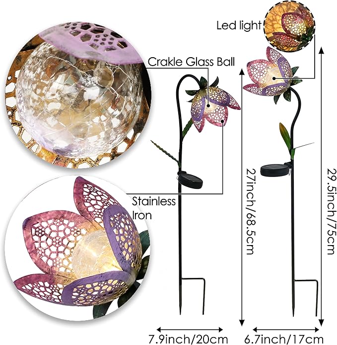 - 【High-Quality & Durable】This solar flowers light is 29.5in tall and very eye-catching, the stems and leaves linking the flowers are made of high quality metal and supported by variable durable wire, which allows you to adjust the direction of the flowers up and down.. It has a waterproof paint finish that is strong enough to withstand harsh weather and will stand in your garden for a long time.