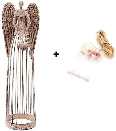 Morning View Vintage Metal Angel Garden Statue with Heart Handbag for Indoor Outdoor Yard Lawn Patio Art Decor with LED Lights String(Style B)