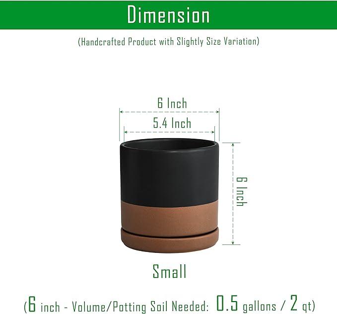 - Small 6 Inch Planter Pot: 6" Diameter x 6" H, black & speckled tan/brown color. Potting Soil Needed: 0.5 gallons / 2 qt.