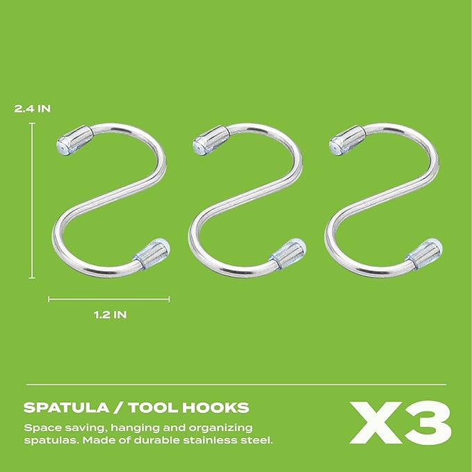 - ⭐ The S-shaped Hooks: Made from durable stainless steel, these hooks are strong enough to hold your cooking tools securely, and their compact size makes them easy to store and transport. These hooks, measure 2.4'' long and 1.2'' wide, can be used to hold the spatulas when not in use, keeping them within reach and preventing them from getting lost or misplaced. the S-shaped hooks are a practical and useful addition to the OUII Flat Griddle Set, helping you to cook with ease and efficiency.