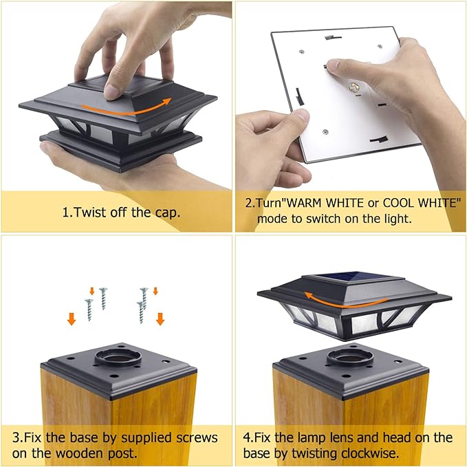 - 【Easy to Use】Install them according to the instructions, fix the base by supplied screws on the wooden post. Solar powered post lights are charged in the daytime for 6-8 hours under the sun, and will turn on for 10-12 hours in the nighttime automatically.