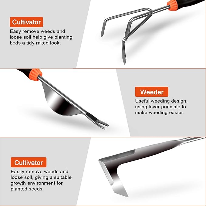 - 【Sturdy Stainless Steel】Our heavy-duty gardening kit for men is constructed of stainless steel, which inhibits rust and guarantees durability. It is lightweight, so you can use it flexibly for gardening work, and your hands are not easily fatigued.The non-slip, soft rubber grip handle makes them a pleasure to use. Additionally, gardening comfort is greatly enhanced by the ergonomic design.