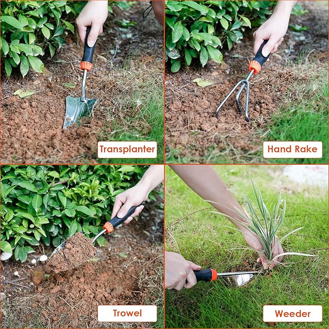 - 【Complete Garden Tools】Our gardening tool set presents everything that you need for planning the backyard paradise of your dreams, including 9 essential items. A trowel, transplant, hand rake, cultivator, weeder, pruner, and handy tote container are all included in this package.