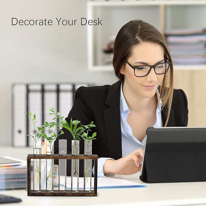 - ❥Scientific plant vase: Perfect combination of natural wood and clear glass, Made of natural wood, Unique 5 test tube wooden Plant Stand design. Simple rooting plant cuttings. Smooth surface, good permeability, beautiful shape, best desktop decorative elevate your home office décor and bring a touch of freshness and elegance to your house & office!