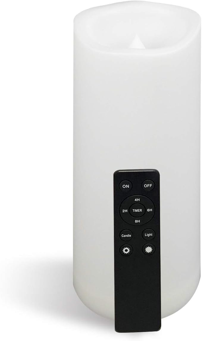 - Remote controlled. Use the remote control to turn on or off this LED flameless pillar candle from a distance up to 20 feet. Remote control is very useful when the plastic pillar candle is difficult to reach or placed in a short distance (less than 20 feet) from you, for example, when this flameless resin candle is put inside an outdoor lantern, on a high rack, a fireplace or a chandelier.