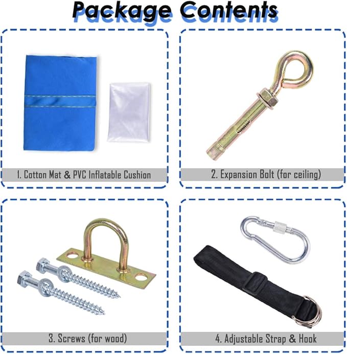 - ★Good Quality of Material – 100% Cotton Mat and Environmentally-friendly PVC Inflatable Cushion. Strong metal screws(for ceiling), hook and adjustable strap.