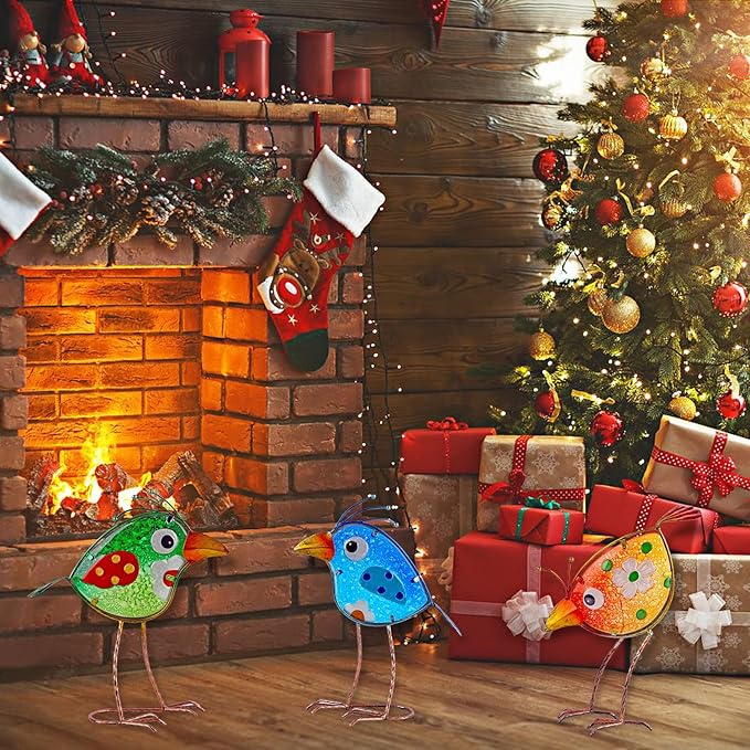 - 【Superior Material】- The dimensions of three birds measure 11 x 9.8 x 4.3 inch, 11 x 9.8 x 4.3 inch and 11.8 x 7.3 x 4.3 inch. Made from high quality iron which dealt with rust prevention and superior glass. This beautiful garden statue will retain the original colors for a long time under different natural weather