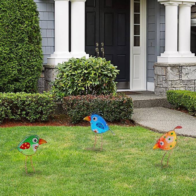 John's Studio Garden Decor for Outside - Outdoor Statue Decorations Metal Bird Glass Yard Art Décor, Lawn Ornaments for Patio Yard Porch, Housewarming Gift - 3 PCS