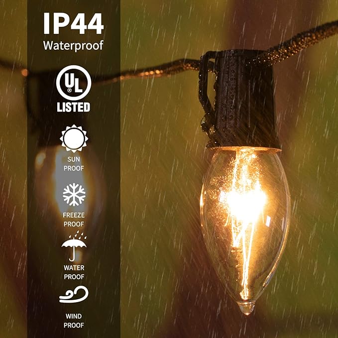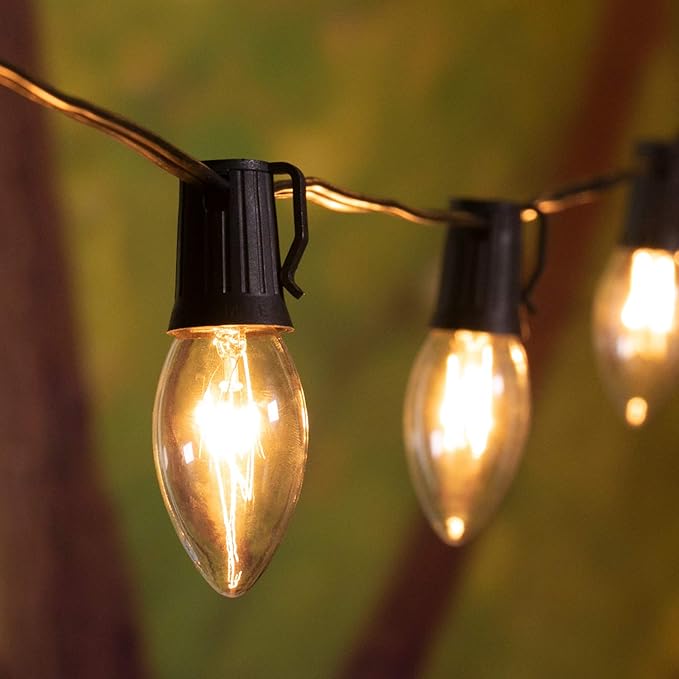 - The bulbs with (E17) socket base; each classic C9 bulb is 7 watts; one bulb goes out will not affect other bulbs; built in fuse for safety and the electrical plug contains a spare fuse; UL listed