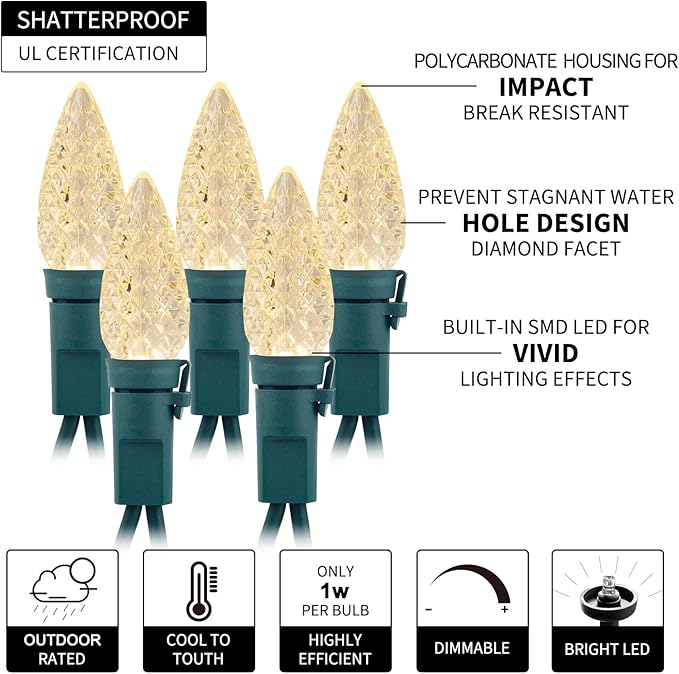 - 【 Super Bright Glow 】- These Christmas light strings feature classic, faceted C6 bulbs made from durable polycarbonate, offering good brightness, colour saturation, ruggedness and reliability. Built-in SMD LED creates vivid lighting effects; the diamond facet hole design prevents stagnant water. Bulbs with vibrant colours will never fade, chip or crack