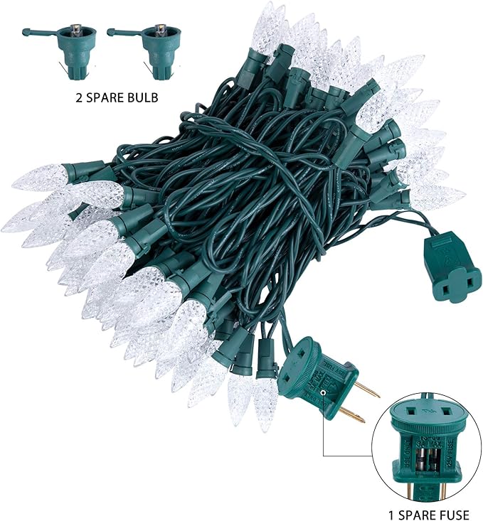- 【 C6 LED Christmas String Lights 】- The plug-in C6 green wire lights are 33 feet long with 100 bright strawberry-shaped LEDs. The heavy-duty wiring and medium-sized LED bulbs add a cheerful and romantic touch to your indoor/outdoor space