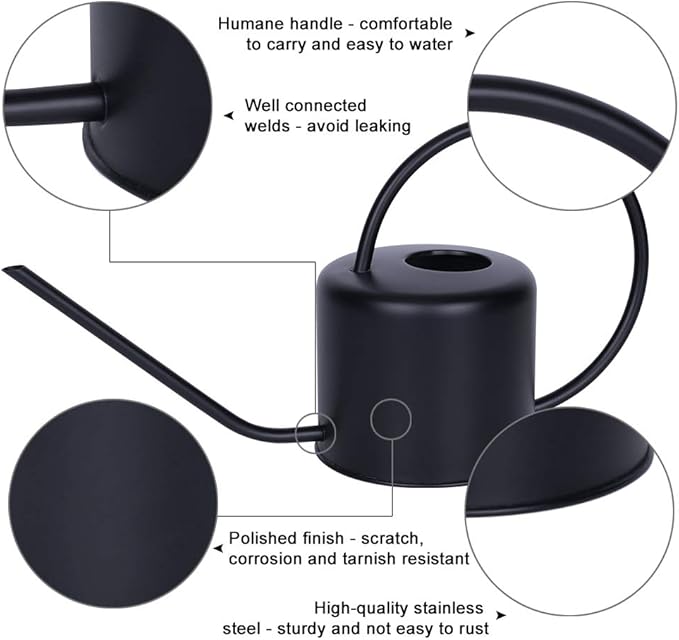 - 【FUNCTIONALITY AND DECORATION IN ONE STAINLESS STEEL WATERING CAN】Do you often forget watering your plants? Then this vintage watering can will remind you! There is a narrow, hollow pipe near the base of the watering pot indoor that enables the water to travel up through the handle and ends up exiting through the spout. Fit for all kinds of indoor or outdoor plants, especially for succulent plants. Nice looking metal with elegant black paint makes watering pail a decent decoration
