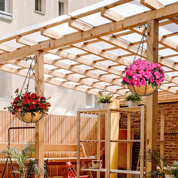 - Natural & Durable Material: For our metal hanging flower basket with pot liners for plants, the coco liners for planters are made of 100% natural coconut fibers which has good air permeability and water retention; the frame and hanging basket chain are made of iron with powder-coated to prevent rust, which is strong and durable. So you can rest assured to use them outdoors