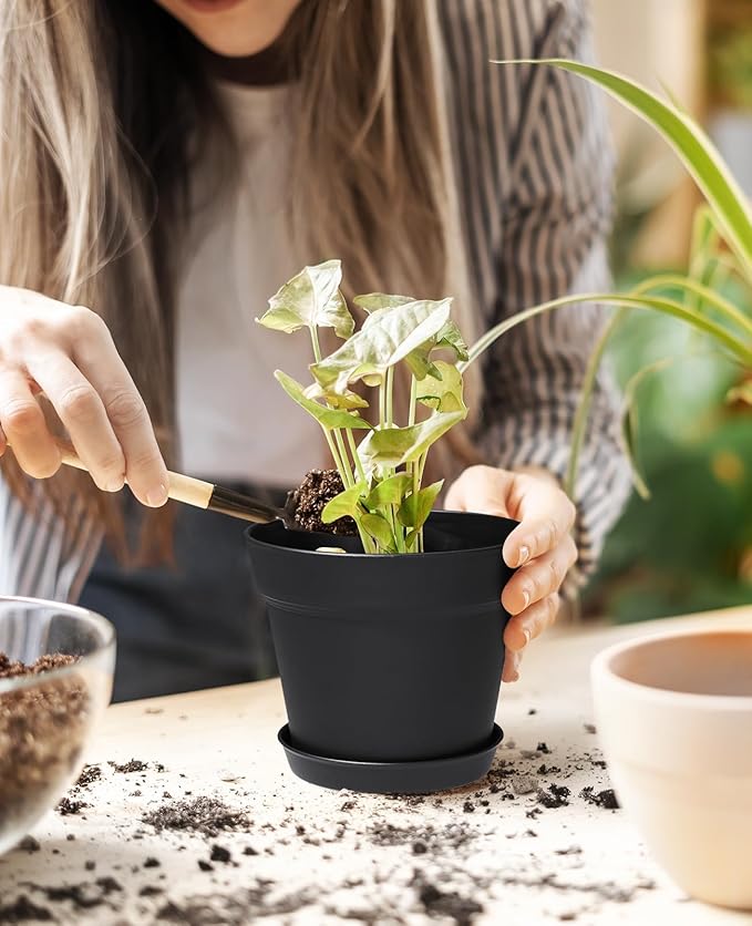 Homenote Pots for Plants, 8 Pcs 7.5 Inch Plastic Planters with Multiple Drainage Holes and Tray - Plant Pots for All Home Garden Flowers Succulents, Matte Black