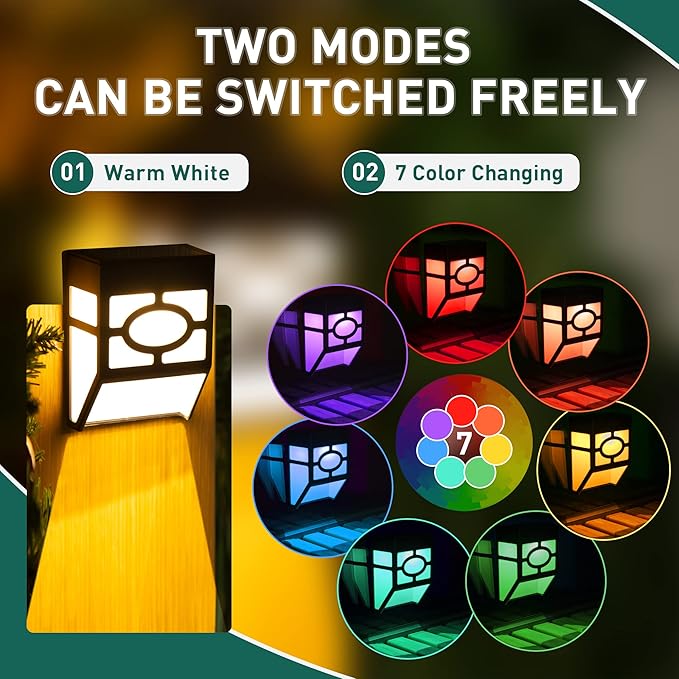 - 【2 MODES】Solar fence lights come with 2 modes: warm white and color-changing RGB. The warm white mode is great for everyday lighting and decoration, while the RGB mode has 7 colors that fade in and out, making it perfect for Halloween and Christmas