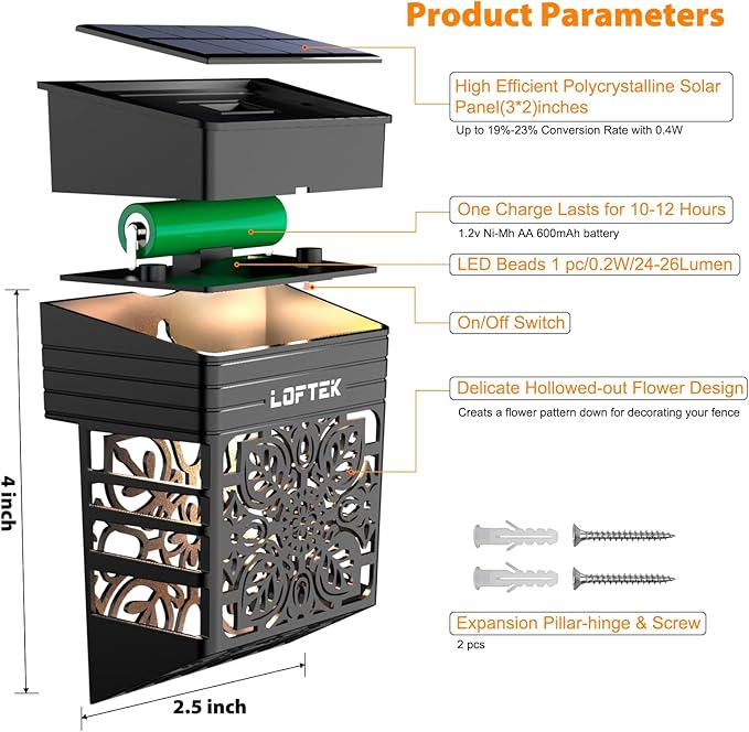 - ใ๐๐๐๐จ๐ซ๐๐ญ๐ข๐ฏ๐ ๐๐จ๐ฅ๐๐ซ ๐ ๐๐ง๐๐ ๐๐ข๐ ๐ก๐ญ๐ฌใ- LOFTEK warm white solar fence lights adopts advanced LED chips and all side Hollowed-out visible lampshade design provides brighter lighting and a wider detection range. It cast a pretty flower pattern that looks gorgeous and adds a nice aesthetic to your garden backyard. 26 lumens brightness is eyes protection and energy-saving than general fence lights. With our solar outdoor lights, you will get many compliments from neighbors. Suitable for Christmas decoration.