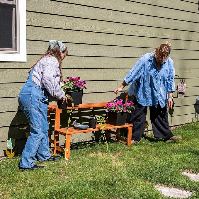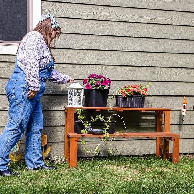 - PLENTY OF SPACE FOR PLANTS: This plant stand measures 47.25" W x 19.5" D x 24" H and weighs 21.6 lbs. The shelves have a depth of 9.75". The top shelf is 24" while the bottom shelf is 13.25". The shelves have a weight capacity of 100 lbs each.