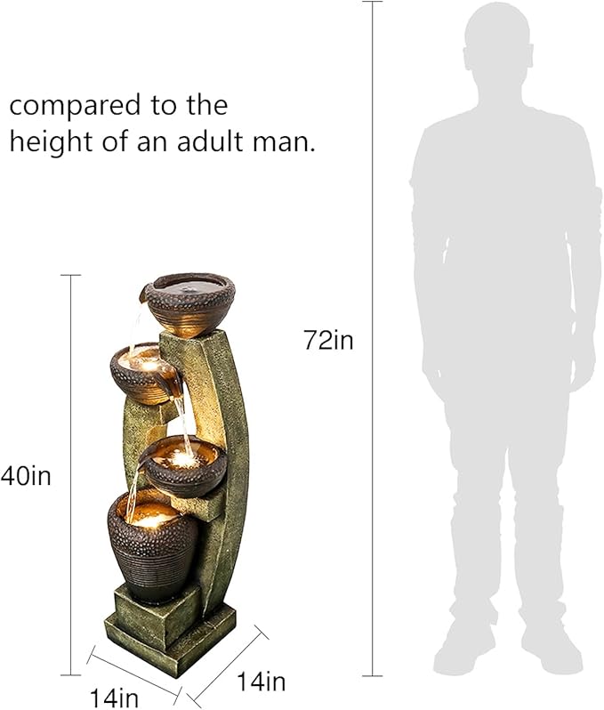 - With the suitable size 14" L x 14" W x 40" H for indoor or outdoor décor. The modern cascading bowls water fountain will add instant beauty to your surroundings.