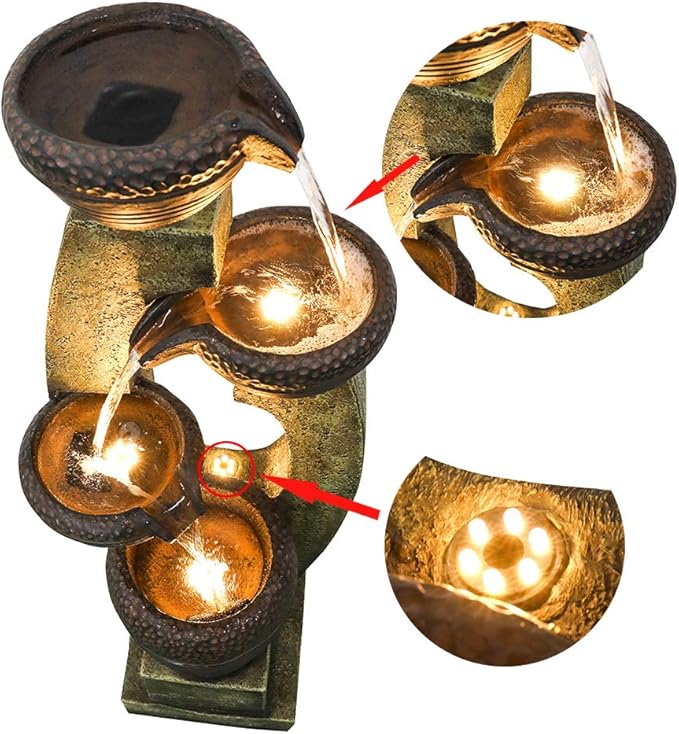 - Built-in LED lights in the lower three basins and the middle “6” hollow out, illuminates the rustic bowl waterfall fountain and water flow day and night.