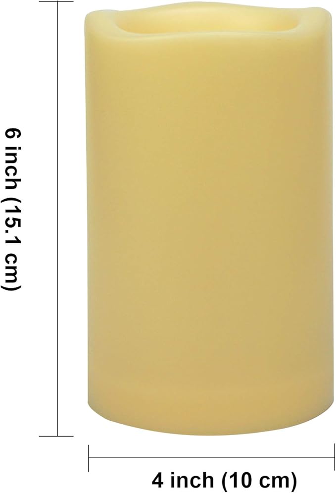 - Big Size Flameless Pillar Candle - Large 4 inch diameter by 6 inch height LED pillar candle is widely used in Halloween, Christmas, holiday seasonal decorations, home, kitchen décor, and weddings, parties, events supplies. It is a decorative light which light up your whole holiday season. Plastic resin battery operated candle can be used booth indoor and outdoor, to decorate your home, kitchen, bedroom, bathroom, patio, yard, garden and pathway.