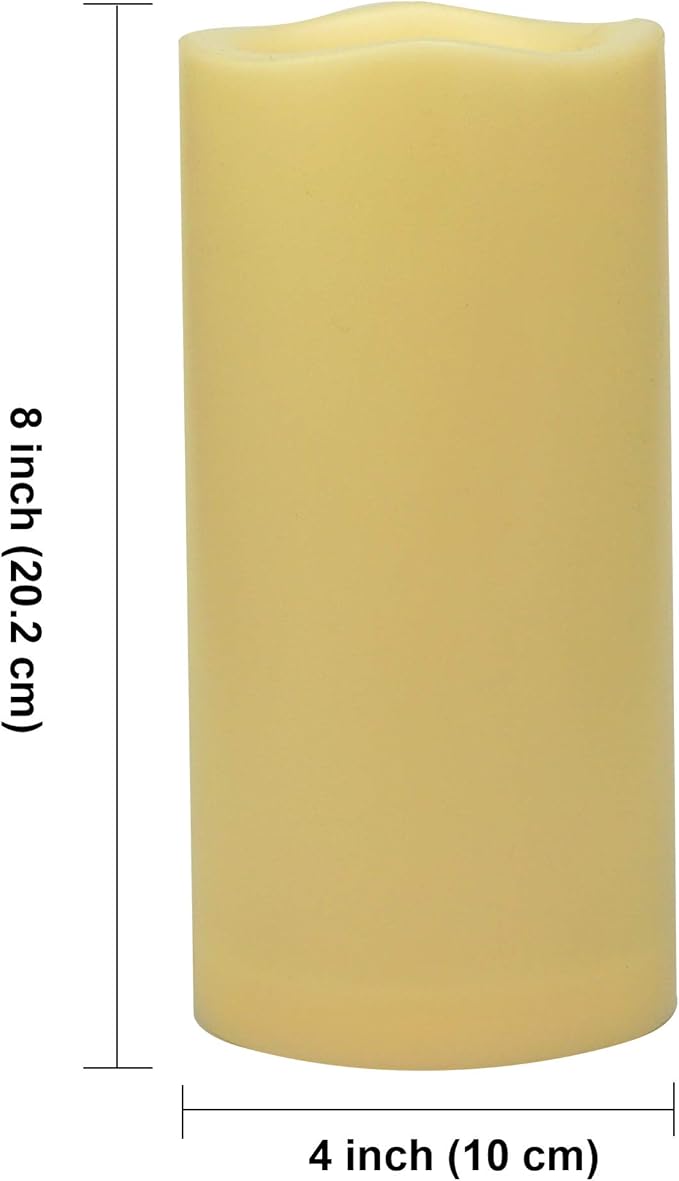 - Big Size Flameless Pillar Candle - Large 4 inch diameter by 8 inch height LED pillar candle is widely used in Halloween, Christmas, holiday seasonal decorations, home, kitchen décor, and weddings, parties, events supplies. It is a decorative light which light up your whole holiday season. Plastic resin battery operated candle can be used booth indoor and outdoor, to decorate your home, kitchen, bedroom, bathroom, patio, yard, garden and pathway.