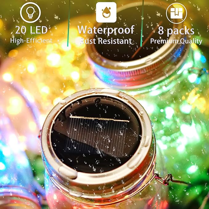 - 👍UPDATED MASON JAR LID LIGHTS - Gorgeous Multi-colored Lights, with 20 micro LED, much brighter than those 10 LED jar lights. Larger solar panel, charge more efficiently. The edge of the lid uses rustproof material instead of cheap alloy, you would find it more durable in humid weather.