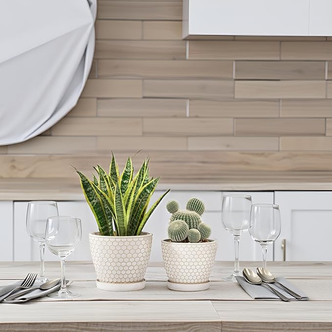 Docrin Ceramic Plant Pots Indoor, 6.6 + 5.5 Inch Flower Pots with Drainage Holes and Saucer for Plants, Set of 2, Milky White Honeycomb
