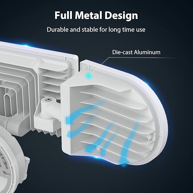 - Long Time Use: Made of resilient die-cast aluminum and designed with a fin-shaped back cover, the LED Security Lights Motion Sensor efficiently dissipates the heat and have a greatly prolonged lifespan. Much more stable and reliable than those made of plastic.