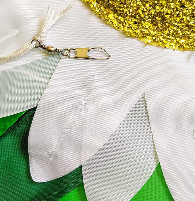 - Includes metal swivel clip and durable string on the top, easy to mount onto tree branches, poles, hooks and more. Windsock portrays the same daisy tinsel flower design on both sides.