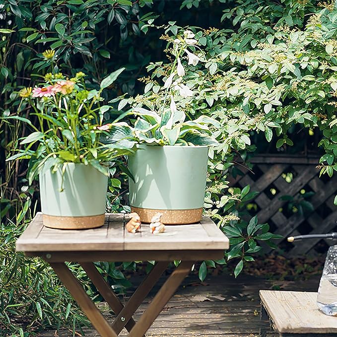 kubvici 8'' Plastic Flower Planter Pots Set of 2 Indoor Outdoor Planters with Drainage Saucer for Garden Home (Green & White, 8 inch)