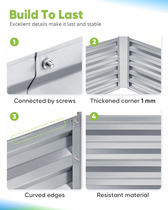 - 【Built To Last】Garden raised planting bed is made of powdered coating galvanized steel panel, assure fine condition of the metal garden bed, it's able to stand harsh weather conditions, won't crack in years, use without worry.