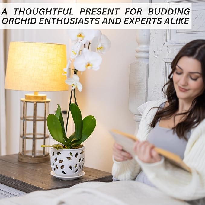- Stunning Style – Place your live orchid in a plant pot made to match its exquisite beauty. This ceramic orchid pot with holes delivers ventilation in the form of decorative leaf cutouts and a modern white glaze.