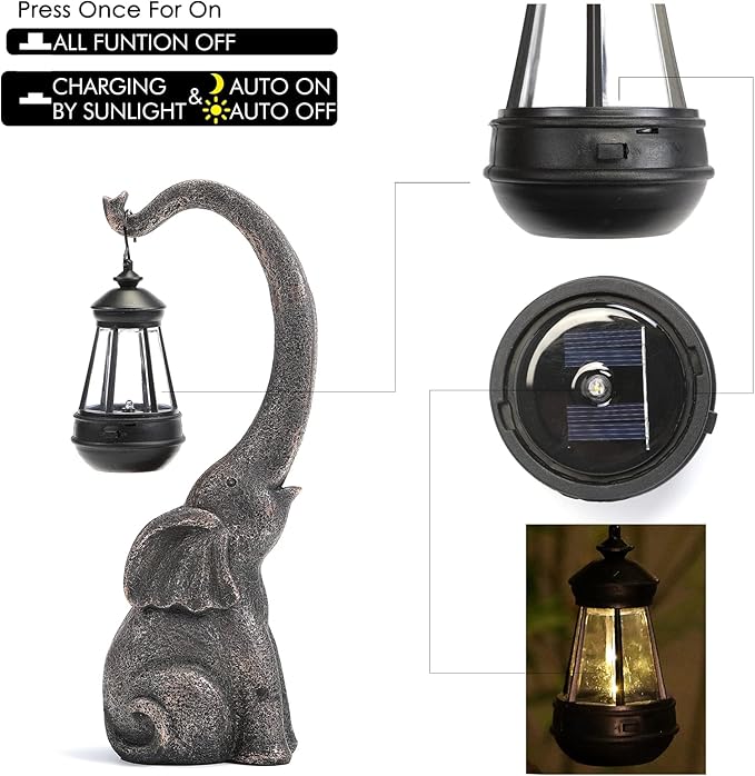 - Wide application: It can be a pathway light to be widely used such as pathway, driveway, flower beds, lawn, yard, patio, garden, balcony and so on. This elephant gifts also can be used as porch decor and even indoor decor where it could get sunshine during the day.