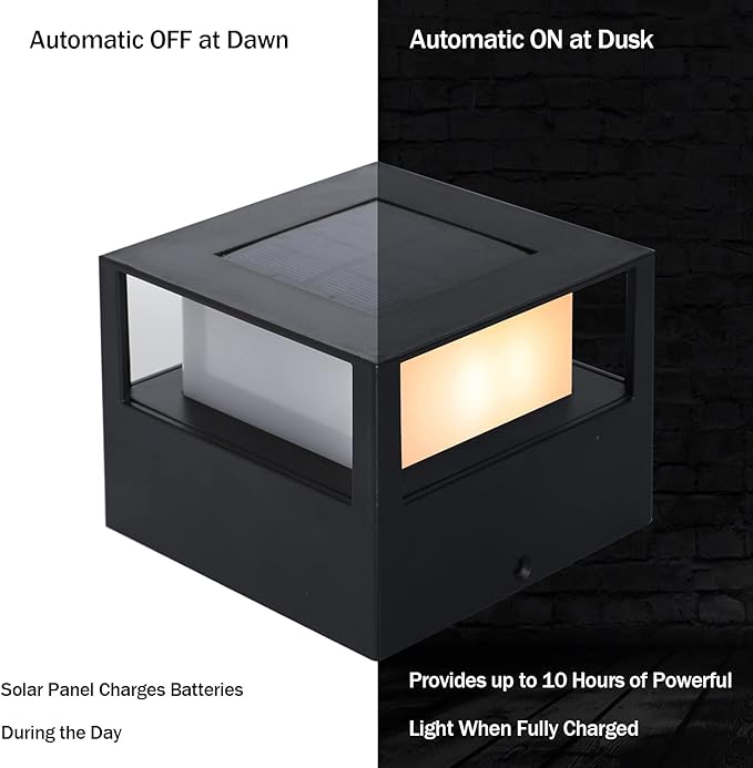 - Decorative and Functional: Viewsun modern post lights will cast a soft glow that automatically brighten up at dusk adding a radiance and distinction to your outdoor spaces. Each solar post cap includes 8 pcs SMD LEDs. Post solar lights combine stylistic details with sleek lines and could coordinate well with different styles of decoration.
