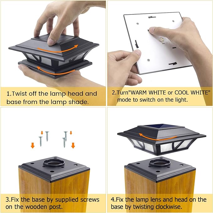 - 【Easy to Use】Install them according to the instructions, fix the base by supplied screws on the wooden post. Solar powered post lights are charged in the daytime for 6-8 hours under the sun, and will turn on for 10-12 hours in the nighttime automatically.
