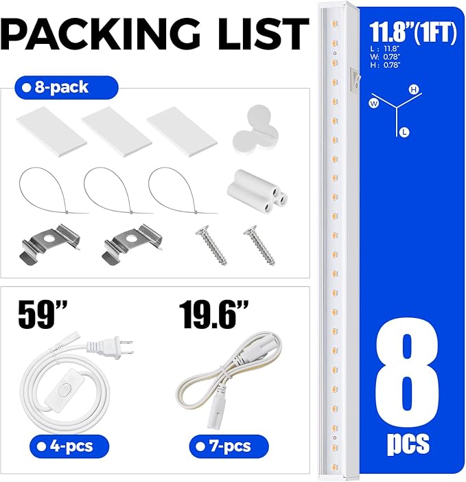 - What You Get: 8 x Barrina T5 Grow Lights, 4 x Power Cords with ON/OFF Switch, 7 x Connecting Cords(20''), 8 x Small Connectors, 16 x Installation Clips, 24 x Double-sided Tapes, 24 x Cable Ties