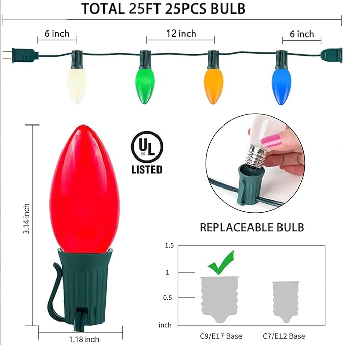 - C9 Christmas Lights: 25FT Colored Christmas tree lights & 25(plus 1 replacement bulbs) C9 Christmas bulbs -Red, Orange, Blue, Green and white bulbs. 7 watts each bulb, 175 watts per string, 120V power. C9/E17 candelabra base.