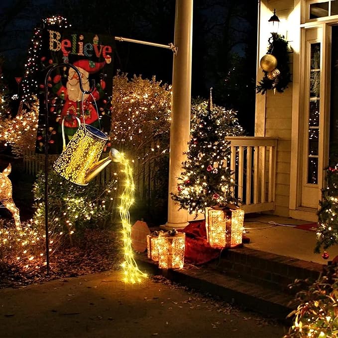 - ✨【PERFECT GIFT】-This twinkle stars shower is a unique and nice decoration for the garden, yard, and outdoor. it is a perfect gift for Eid Mubarak, Mother's Day, Father's Day, Birthday Gift, Gardner's gift. and enjoy every beautiful evening with your family and friends together.(Since this watering can light is solar powered, you need to turn on the switch to absorb the light energy. The lights will automatically light up in the dark)