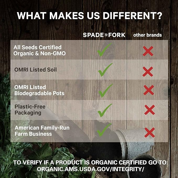 - Top Quality Ingredients - Each Spade To Fork plant sprouting box set contains 5 types of Certified USDA Organic Non GMO indoor flower seeds, including Sunflower, Nasturtium, Borage, Sweet Thai Basil and Dill; 5 OMRI listed compostable peat pots; 5 OMRI listed rich potting soil discs; 5 custom wood burned plant markers; our beautiful illustrated 26pg growing guide.