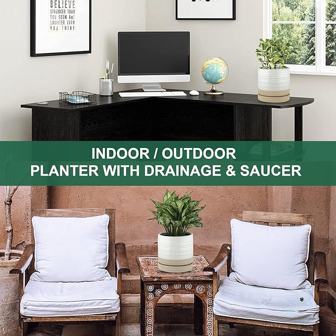6 Inch Plant Pots, Ceramic Planter Pot with Drainage Hole & Saucer, Indoor/Outdoor Cylinder Round Planter Pot, White & Beige Glaze