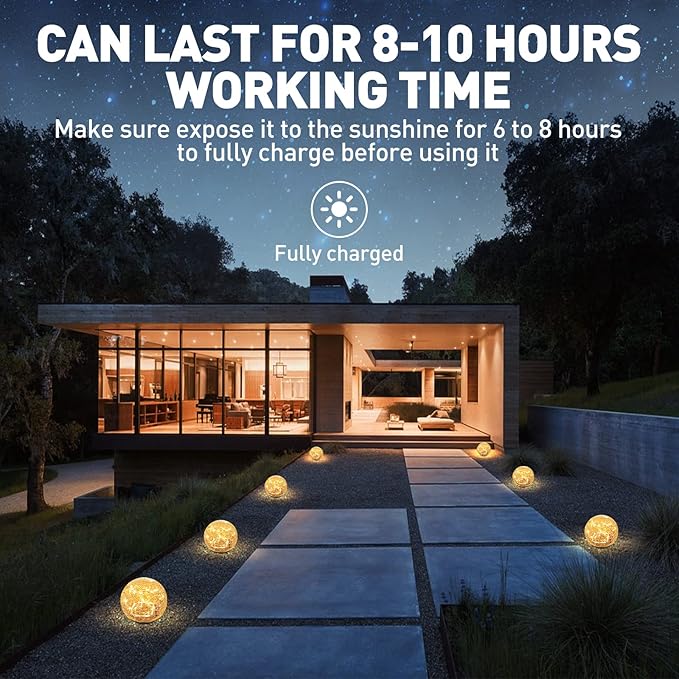 - Automatically Turn ON & Off:1 Globe per Pack, first put switch on (Please try the switch in the dark house or at night), it will automatically turn on at night and turn off during the day. It only needs 6-8 hours to be fully charged and can last for 8-10 hours working time. (Make sure expose it to the sunshine for 6 to 8 hours to fully charge before using it).