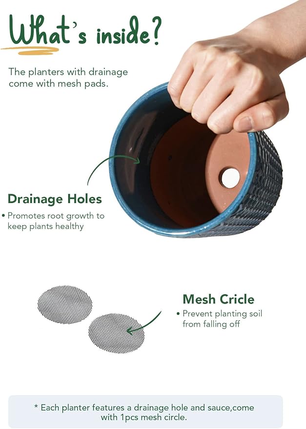 - Thoughtful Accessories: These indoor plant pots are equipped with drainage holes and saucers, ensuring proper drainage to prevent root rot. The saucer helps to catch any excess water and prevent leaks, while the mesh pad retains soil and promotes optimal ventilation. (Plant not included)